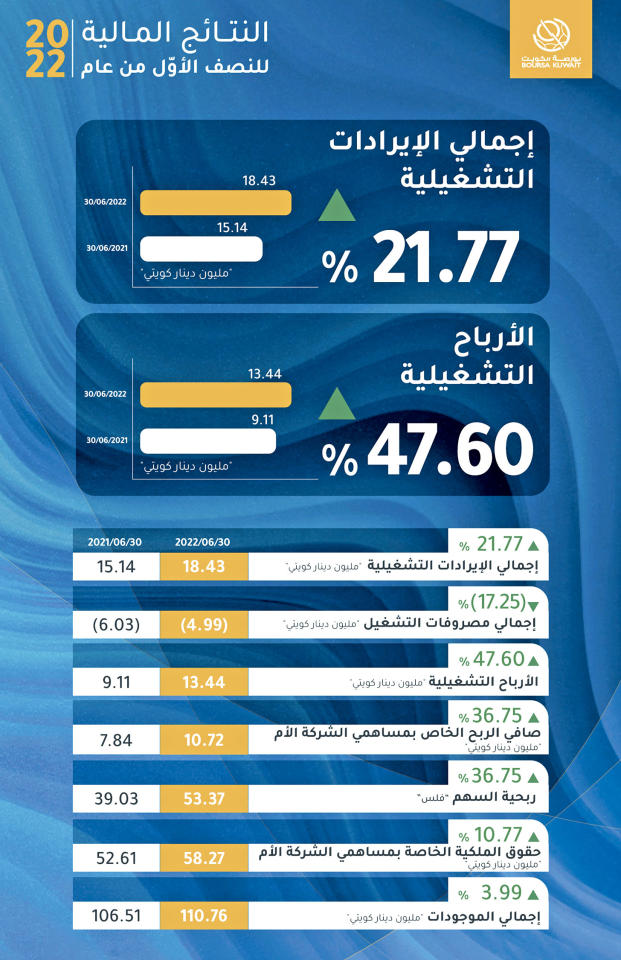 وبلغ إجمالي الإيرادات التشغيلية 18.4 مليونا، بزيادة 21.8 بالمئة عن نفس الفترة من عام 2021، التي بلغت حوالي 15.1 مليونا. وبهذه المناسبة، صرححمد الحميضي «سجلت البورصة أرباحاً بلغت 10.7 ملايين، أي ما يعادل زيادة بحوالي 37 بالمئة عن نفس الفترة من عام 2021، والذي بلا شك يعكس قوة استراتيجية الشركة ونموذجها التشغيلي وملاءتها المالية. كما تدل هذه النتائج على قدرة الشركة وسوق المال الكويتي على مواكبة شتى التحديات». وأضاف الحميضي: «نأمل أن تشكل النتائج التي حققناها في الأشهر الـ 6 الأولى من هذا العام، وبالرغم من التقلبات التي شهدتها أسواق المال حول العالم مؤشراً إيجابياً لما هو أفضل لبورصة الكويت، التي أصبحت منذ خصخصتها عام 2019، نموذجاً يحتذى، وشركة مدرجة جاذبة للمستثمرين من جميع أنحاء العالم بفضل ممارساتها ونموذج أعمالها الفعّال والمستدام والمسؤول. ختاماً، أود أن أشكر زملائي أعضاء مجلس الإدارة والإدارة التنفيذية وموظفي بورصة الكويت الأكفاء على جهودهم الحثيثة خلال هذا العام لتطوير الشركة، وسوق المال الكويتي والاقتصاد الوطني».ويعود الارتفاع في الأرباح إلى ارتفاع إجمالي قيمة التداول بنسبة 30.1 بالمئة، بما في ذلك ارتفاع قيمة التداول في السوق «الأول» بنسبة 47.5 بالمئة، مقارنة بالنصف الأول من عام 2021. وبلغت قيمة التداول المسجلة للنصف الأول من عام 2022 حوالي 8.4 مليارات، بينما بلغ عدد الأسهم المتداولة حوالي 31.2 مليار سهم، مما ساهم في ارتفاع أرباح الشركة.وأعلنت بورصة الكويت في 7 يونيو الماضي إدراج شركة أولاد علي الغانم للسيارات في السوق الأول تحت رمز التداول «الغانم»، وضمن قطاع «السلع الاستهلاكية»، ليبلغ بذلك عدد الشركات المدرجة في السوق 159 شركة، بما في ذلك 27 مدرجة في السوق الأول.