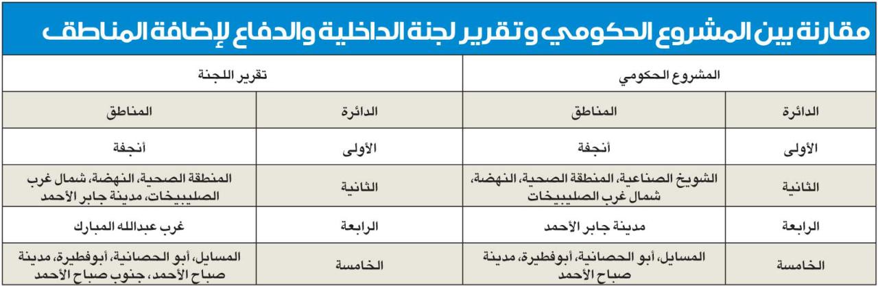 وفي استعراض الآراء حول الأمر، أتت الاقتراحات النيابية بخلاف مشروع الحكومة، حيث جاء اقتراح بضمّ مدينة جابر الأحمد الى الدائرة الثانية، على خلاف المشروع الحكومي الذي وضعها ضمن «الرابعة»، وضم منطقة النهضة الى «الرابعة» أيضا، على خلاف ما جاء به المشروع الحكومي بضمّها الى «الثانية».كما جاء في الاقتراحات ضم مدينة جنوب صباح الأحمد الى الدائرة الخامسة، وضاحية غرب عبدالله المبارك الى «الرابعة».وخلصت لجنة الداخلية والدفاع البرلمانية، في تقريرها رقم 23 المؤرخ 29 مارس 2021، الى ما جاء في الاقتراح النيابي بضمّ مدينة جابر الأحمد الى الدائرة الثانية، وإضافة «غرب عبدالله المبارك» الى «الرابعة»، وإضافة مدينة جنوب صباح الأحمد الى «الخامسة»، وإلغاء «الشويخ الصناعية» من الدائرة الثانية، وهو ما جاء به مشروع الحكومة.وانتهى تقرير اللجنة إلى ضم منطقة أنجفة الى الدائرة الأولى، والمنطقة الصحية والنهضة وشمال غرب الصليبيخات ومدينة جابر الأحمد الى «الثانية».وأضاف ضاحية غرب عبدالله المبارك الى «الرابعة»، وضم المسايل وأبو الحصانية وضاحية أبو فطيرة ومدينتَي صباح الأحمد وجنوب صباح الأحمد الى «الخامسة».