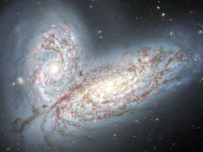تمكَّن علماء مرصد Gemini North، الذي يضم تلسكوبات طولها 8 أمتار في ولاية هاواي الأميركية، من التوصل إلى صورة مذهلة لتصادم حدث بين مجرتين حلزونيتين ضخمتين، تبعدان في كوكبة Virgo أو «العذراء» بدائرة البروج، أكثر من 60 مليون سنة ضوئية عن الأرض، بحيث ظهرت المراحل المبكرة من الاندماج العظيم على شكل فراشة كونية جميلة، بهرت العلماء والناس العاديين. وأكدت الصورة الطبيعة المذهلة لظهور الكون، والذي يبدو مختلفاً يوماً بعد يوم لمراصد وتلسكوبات وأقمار صناعية جوالة للرصد من الفضاء، فتدهش العلماء والناس العاديين، ومنها بدت مجرة NGC 4568 وهي في حالة مبكرة من اندماج مذهل مع مجرة NGC 4567 المرتبطة معها بعلاقة ضمن مجال الجاذبية المتبادل، بحيث استمرت الأشكال الحلزونية الأصلية لكلتا المجرتين واضحة بالصورة التي نشرتها «العربية. نت» أمس الأول، نقلاً عما ورد ببيان نشره وأصدره NOIRLab المعروف كمختبر يقوم بتشغيل مرصد «جميني شمال» في هاواي.وتظهر صورة «الفراشة» التي أنتجها مرصد Gemini North من البيانات التي قام في 2020 بجمعها، مستعراً أعظم، نتج عن انفجار كوني لامع لنجم ضخم سمّوه SN 2020fqv حين رصدوه قبل عامين لأول مرة، وهو الظاهر بالصورة كنقطة مضيئة تقع وسط أحد الأذرع الحلزونية لإحدى المجرتين.