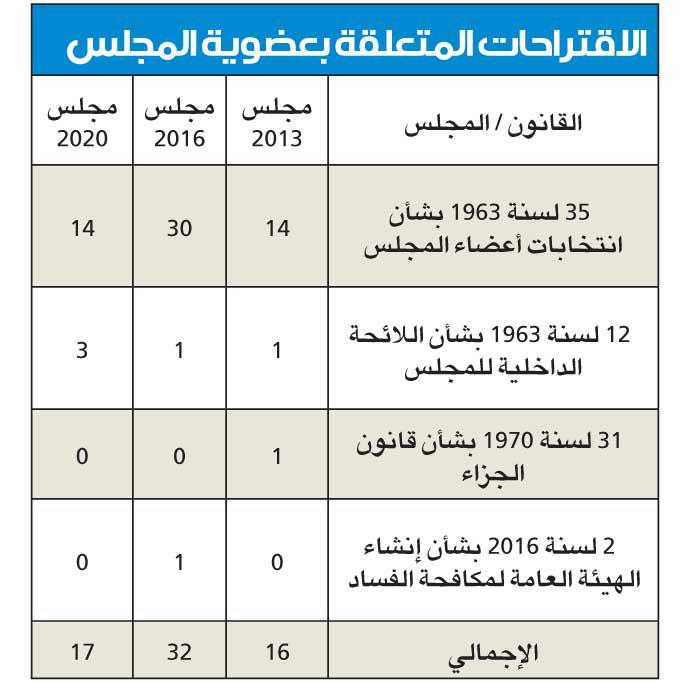 كما أظهرت إحصائية «الجريدة»، أن إجمالي ما قدم من اقتراحات بقوانين من النواب منذ مجلس 2013 والمتعلق بعضوية مجلس الأمة هو 65 اقتراحاً منها 58 تتعلق بقانون رقم 35 لسنة 1963 بشأن انتخابات أعضاء مجلس الأمة، 5 منها متعلقة بقانون رقم 12 لسنة 1963 بشأن اللائحة الداخلية لمجلس الأمة، واحد منها تعلق بتعديلات قانون رقم 31 لسنة 1970 بشأن قانون الجزاء، وواحد بشأن قانون رقم 2 لسنة 2016 بشأن انشاء الهيئة العامة لمكافحة الفساد.