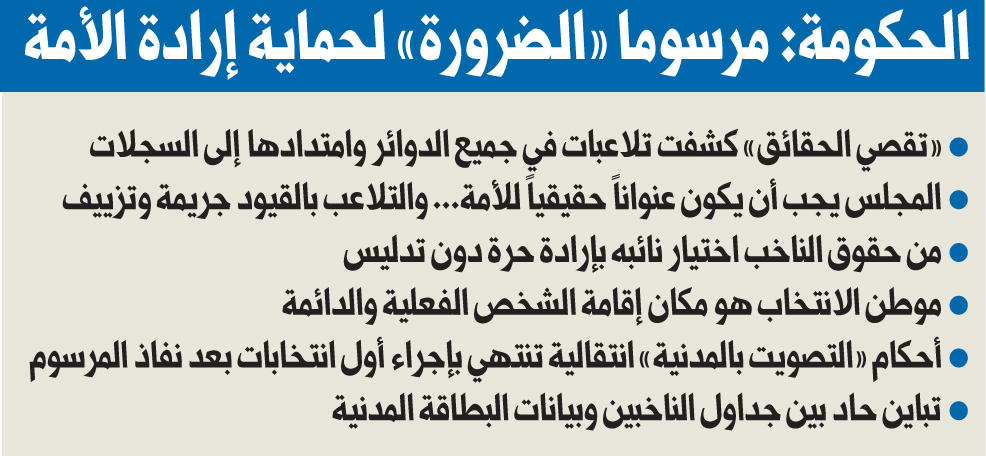 أكدت مصادر وزارية لـ «الجريدة» عدم صحة ما يتردد بشأن أن مرسوم الضرورة الخاص بالتصويت عبر البطاقة المدنية، يسمح لكل من أتم الـ 21 عاماً بالمشاركة في العملية الانتخابية، مبينة أن تلك المشاركة مقتصرة على المقيدين بالجداول السابقة التي حُصنت في يونيو الماضي، مع التزام المواطنين بالقيد المعتاد في فبراير سنوياً.وقالت المصادر إن التعديلات الجديدة استهدفت سد أي شبهة قانونية للطعن على العملية الانتخابية، ولذا وضع المرسوم مدداً للاعتراض والطعن أمام قضاة الطعون الانتخابية تنتهي الأسبوع المقبل وعقب الفصل فيها، تصبح الجداول محصنة وحجة على الناخبين وصالحة للانتخابات المقبلة. وأشارت إلى أن الحكومة جاهزة للرد على أي طعون قد تقام على مراسيم الضرورة في حال الطعن عليها أمام المحكمة الدستورية، بعدما تأكد لديها توافر حالة الضرورة التي استدعت إصدارها بعد غياب مجلس الأمة وذلك وفقاً للمادة 71 من الدستور، مشددة على أن الواقع كشف تلاعبات على مواطن الناخبين في عدد من الدوائر، مما استدعى تعديلها تشريعياً بربط موطن الناخبين بالعناوين المقيدة لدى هيئة المعلومات المدنية؛ صوناً لإرادة الأمة في اختيار النواب.