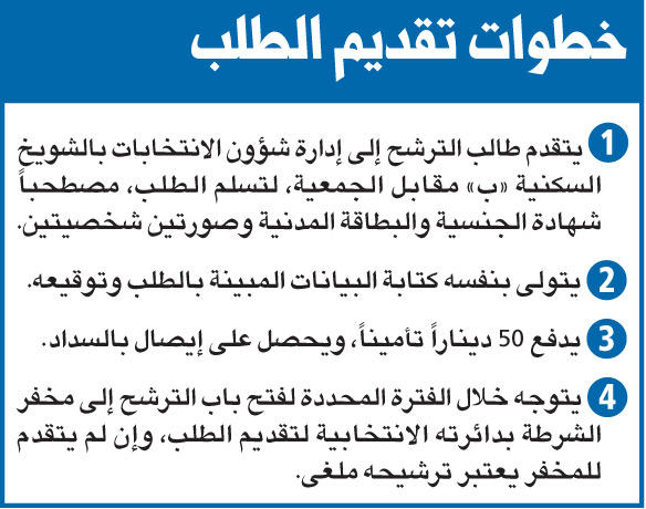 وبينما فتحت إدارة شؤون الانتخابات باب تسجيل المناديب والوكلاء ومتطوعي الداخلية، كشف المدير العام للشؤون القانونية في «الداخلية» العقيد حقوقي صلاح الشطي، لـ «الجريدة»، أن إدارة «الانتخابات» ستفتح باب الترشح اليوم ويستمر 10 أيام متتالية في موقعها بمنطقة الشويخ السكنية من الـ 7:30 صباحاً حتى الـ 1:30 ظهراً، داعياً الراغبين في الترشح إلى اصطحاب شهادة الجنسية الأصلية و50 ديناراً مبلغاً للتأمين.وأكد الشطي أن «الداخلية»، ممثلة بإدارة الشؤون القانونية وإدارة شؤون الانتخابات، أكملت استعداداتها وسيصدر نائب رئيس مجلس الوزراء وزير الدفاع وزير الداخلية بالوكالة الشيخ طلال الخالد قراراً بتحديد 5 مخافر لاستقبال طلبات الترشح، إذ خصص مخفر الدعية للدائرة الأولى ومخفر الشامية للثانية ومخفر كيفان للثالثة، و«العمرية» للرابعة، و«العدان» للخامسة.