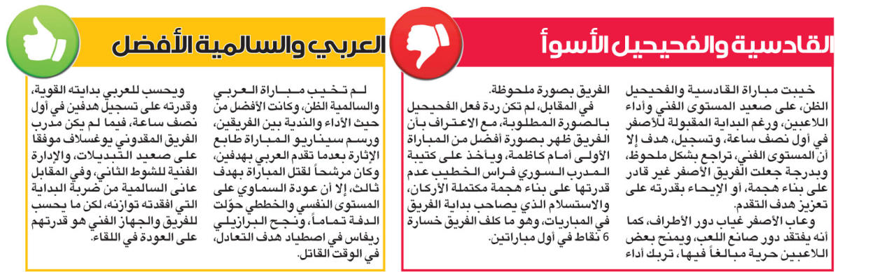 ومن جهته، افتقد كاظمة الأداء الجماعي، وحلت بدلا منه الحلول الفردية للاعبيه، ويعد المدافع الجزائري عماد الدين عزي الأبرز، سواء بهدفه في مرمى الجهراء أو بدوره الدفاعي.أما الجهراء فقد واصل أداءه المقبول، ولا يعيب مدرب السلوفاني ساندي اعتماده على الدفاع، وشن هجمات مرتدة مثلت خطورة على مرمى كاظمة، ولذلك استحق التعادل.بدوره، واصل النصر تقديم مستوياته الجيدة، بفضل تألق لاعبيه محمد دحام وفهد العنزي والنيجيري سيسوجه، وفوزه على الساحل 1-3 مجرد بداية لانتصارات أخرى قادمة.ويبدو أن الساحل يسير على غرار الموسم الماضي مستوى بلا بنتائج، فالفريق يدافع جيدا ويهاجم بقوة لكنه يخسر في الجولتين!
