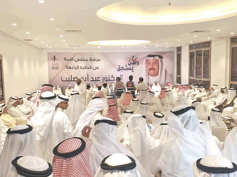 ذكر مرشح الدائرة الرابعة د. عيد أبو صليب أن قرار خوض الانتخابات جاء استجابة لتطلعات القيادة بوجود مجلس أمة فاعل ومنتج، مشيرا إلى أن التبشير بعهد جديد قائم على النزاهة، وعدم تدخل الحكومة في مخرجات الانتخابات واختيارات الأمة يعطي دفعة قوية لكل وطني ليكون عنصرا فاعلا في الموقع الذي يعتقد أنه سيعطي من خلاله.وقال أبو صليب، خلال ندوة لناخبي الدائرة في ديوانه بمنطقة العارضية، إن الإصلاح ليس كلمة تقال أو شعارا يرفع، وإنما إجراءات ملموسة وتشريعات مطلوبة وتدابير عاجلة تستدعي إسناد الأمور إلى الكفاءات الوطنية المخلصة والبدء بمحاسبة المفسدين وملاحقة سراق المال العام.