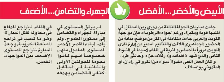 لعل أسوأ ما في الجولة الثالثة، ما اقترفه ثلاثة من محترفي الكويت والعربي في مواجهتهما من أخطاء فادحة.ففي وقت تسيّد الكويت اللقاء أشهر الحكم الكرواتي إيفان بيبيك البطاقة الحمراء بوجه محترف الفريق المهدي برحمة بسبب خشونته التي لا داعي لها كونها لعبة عادية في وسط الملعب.وبصعوبة بالغة قلص لاعبو العربي النتيجة، لتبدأ رحلة البحث عن هدف التعادل، قبل أن يعود الحكم ليطرد محترف الأخضر الجزائري طارق بوعبطة بسبب سوء السلوك.أما الليبي السنوسي الهادي فتسبب بدوره في خسارة العربي حينما تعامل برعونة مع المصري عمرو عبدالفتاح، ليحتسب بيبيك ركلة جزاء صحيحة.وبدلا من أن يحمل المحترفون على عاتقهم المسؤولية والتعامل بهدوء وصناعة الفارق مع فريقيهما، تعاملوا بشكل لا يمت بصلة للاحتراف وتسبب كل منهم بالضرر لفريقه على طريقته!.