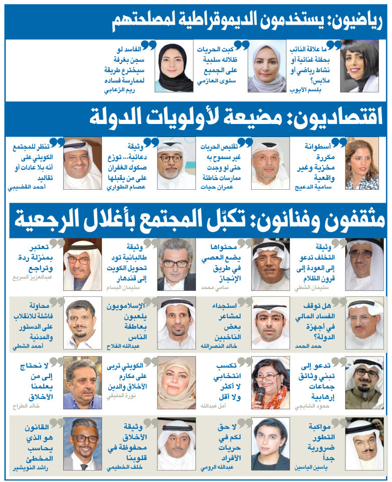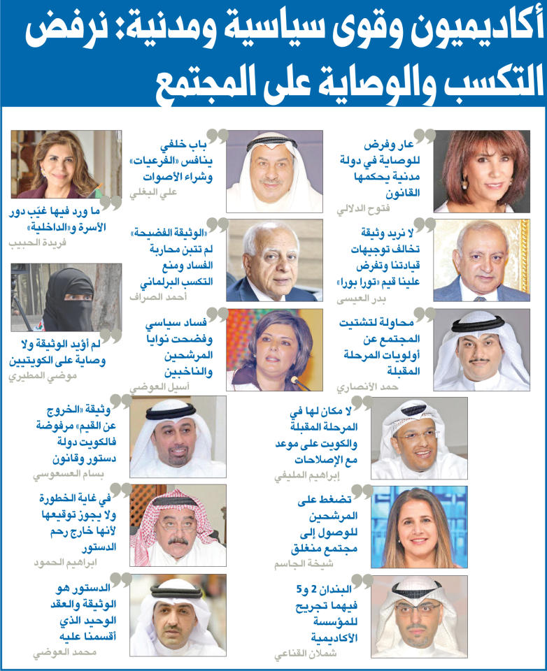 عبرت الأوساط السياسية والاقتصادية والاجتماعية والرياضية والفنية عن رفضها المطلق والقاطع لما جاء فيما يسمى «وثيقة القيم» التي أطلقتها مجموعة من التيارات الدينية، مؤكدة أن هذه الوثيقة تسعى للوصاية على عقول ومبادئ وقيم أهل الكويت، التي جبلوا عليها من التسامح والتعايش وقبول الآخر دون مساس بالحريات والمعتقدات والأفكار، مشددين على أن القبول بهذه الوثيقة يعني ضياع قيم الدولة المدنية والعودة إلى الرجعية والتخلف وأفغنة الكويت بقيم «تورا بورا».