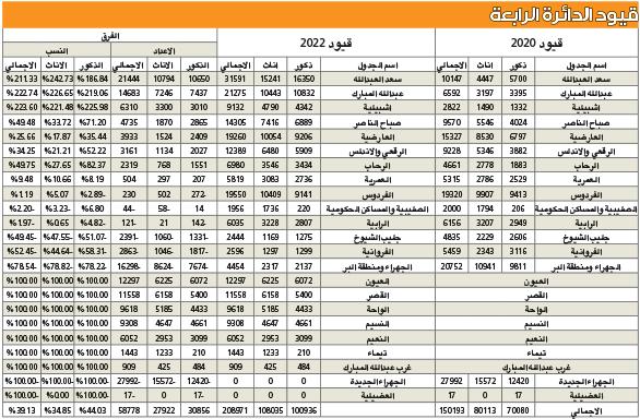 وبلغ عدد قيود الرجال في الدائرة بحسب السجلات الأخيرة 100936 قيداً مشكلة ما نسبته 48.3 في المئة، وقيود النساء 108035 قيداً بما نسبته 51.7 في المئة من ناخبي الدائرة، وبنسبة زيادة عن سجلات الانتخابات الماضية 44 في المئة للرجال (70080 قيدا)، و35 في المئة للنساء (80113 قيداً).ولا تزال الدائرة الرابعة في المرتبة الثانية من حيث عدد الناخبين بين الدوائر الخمس، كما شهدت الدائرة تغيرا في جداولها عبر مرسوم رقم 6 لسنة 2022، وذلك باضافة منطقتي غرب وجنوب عبدالله المبارك، وإعادة تقسيم جدول الجهراء الجديدة الى 6 جداول منفصلة وهي كل من العيون والقصر والواحة والنسيم والنعيم وتيماء.وبقراءة سجلات الدائرة، وجد أن سجل الانتخابات الحالية أزيل منه جدول الجهراء الجديدة واعيد تقسيمها على 6 جداول والتي اتت بالمرسوم رقم 6، كما أنه تمت ازالة جدول العضيلية من السجلات الاخيرة، وبالرغم من ان المرسوم رقم 6 اشار الى اضافة منطقة جنوب عبدالله المبارك إلى الدائرة فإنها لم توضع في جدول منفصل كما هي الحال في غرب عبدالله المبارك التي اتت قيودها في جدول منفصل، وهو الأمر الذي يبرر الزيادة التي طرأت على جدول عبدالله المبارك بدمج قيود جنوب عبدالله المبارك معها، والتي شكلت 222 في المئة بجدول عبدالله المبارك، بعد زيادة بلغت 14683 قيداً عن السجلات الماضية والتي سنأتي على تفصيلها.أما من حيث التغير في عدد القيود على مستوى مناطق وجداول الدائرة الرابعة، فجاءت منطقة سعد العبدالله في المرتبة الأولى من حيث عدد الزيادة وبلغت 21444 قيداً منها 10650 للرجال و10794 للنساء، وارتفع إجمالي الناخبين فيها من 10147 إلى 31591 قيداً، بنسبة زيادة بلغت 211 في المئة، تلتها في المرتبة الثانية عبدالله المبارك بزيادة بلغت 14683، منها 7437 للرجال و7246 للنساء، وارتفع إجمالي الناخبين فيها من 6592 إلى 21275، وبنسبة زيادة بلغت 222 في المئة.وجاءت منطقة اشبيلية في المرتبة الثالثة بزيادة 6310 قيداً، منها 3010 للرجال و3300 للنساء، وارتفع عدد الناخبين فيها من 2822 إلى 9132، وبنسبة زيادة بلغت 223 في المئة، وجاءت منطقة صباح الناصر في المرتبة الرابعة بزيادة 4735 قيداً، منها 2865 للرجال و1870 للنساء، وارتفع عدد الناخبين فيها من 9570 إلى 14305.وأتت منطقة العارضية في المرتبة الخامسة بزيادة 3933 قيداً، منها 2409 للرجال و1524 للنساء، وارتفع عدد الناخبين فيها من 15327 إلى 19260، وجاءت منطقة الرقعي والأندلس في المرتبة السادسة بزيادة 3161 قيداً، منها 2027 للرجال و1134 للنساء، وارتفع عدد الناخبين فيها من 9228 إلى 12389.فيما جاءت الرحاب في المرتبة السابعة بزيادة 2319 قيداً، منها 1551 للرجال و768 للنساء، وارتفع عدد الناخبين فيها من 4661 إلى 6980، وجاءت العمرية في المرتبة الثامنة بزيادة 504 قيود، منها 207 للرجال و297 للنساء، وارتفع عدد الناخبين فيها من 5315 إلى 5819.وأتت منطقة الفردوس في المرتبة التاسعة بزيادة 230 قيدا، ولكن مع تسجيلها نقصا في قيود الرجال بلغ 272 قيداً، مقابل زيادة في قيود النساء بلغت 502 قيد، وارتفع عدد الناخبين فيها من 19320 إلى 19550.