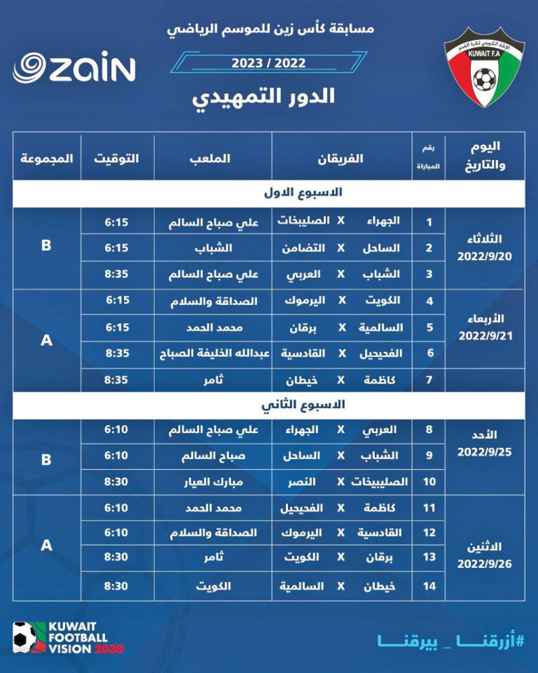 أصدرت لجنة المسابقات بالاتحاد الكويتي لكرة القدم، جدول بطولة كأس الاتحاد التنشيطية، وتنطلق البطولة الثلاثاء المقبل، بسبب توقف النشاط خلال «فيفا داي».ويلتقي في الجولة الأولى الثلاثاء الجهراء مع الصليبيخات، والساحل مع التضامن، والشباب مع العربي، على أن تُستكمل المنافسات في اليوم التالي بمباريات الكويت مع اليرموك، والسالمية مع برقان، والفحيحيل مع القادسية، وكاظمة مع خيطان.