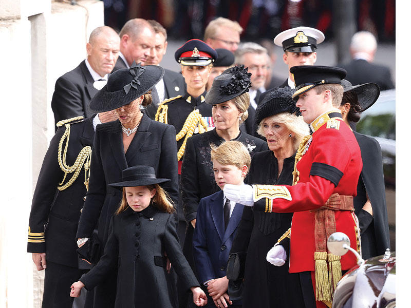 ودخل نعش إليزابيث الثانية إلى كاتدرائية ويستمنستر بعدما نقل على أنغام مزامير القربى وقرع الطبول عزفها عناصر من البحرية الملكية من قصر ويستمنستر حيث كان مسجى منذ خمسة أيام. وحمل النعش الملفوف بالراية الملكية والذي يعلوه تاج الإمبراطورية ثمانية عناصر من الحرس الملكي ووضع على عربة مدفع في مسيرة إلى كاتدرائية ويسمتنستر.ووصل النعش في مسيرة ومشى وراءه نجلها الملك تشارلز البالغ 73 عاماً وأبناء الملكة الآخرون آن واندرو وإدوارد ووريث العرش وليام الذي بات أمير ويلز والأمير هاري باللباس المدني نظراً إلى انسحابه من نشاطات العائلة الملكية في 2020. وانضمت إليهم داخل الكاتدرائية قرينة الملك كاميلا وزوجة وليام أميرة ويلز كايت وميغان زوجة الأمر هاري. وقد مشى الأمير جورج (تسع سنوات) والأميرة شارلوت (سبع سنوات) طفلا الأمير وليام وراء نعش الملكة لدى دخوله الكاتدرائية.وانتهت المراسم بدقيقتي صمت في كل أرجاء البلاد ومن ثم النشيد الوطني الجديد «غود سايف ذي كينغ» (ليحفظ الرب الملك).«كنت هناك»