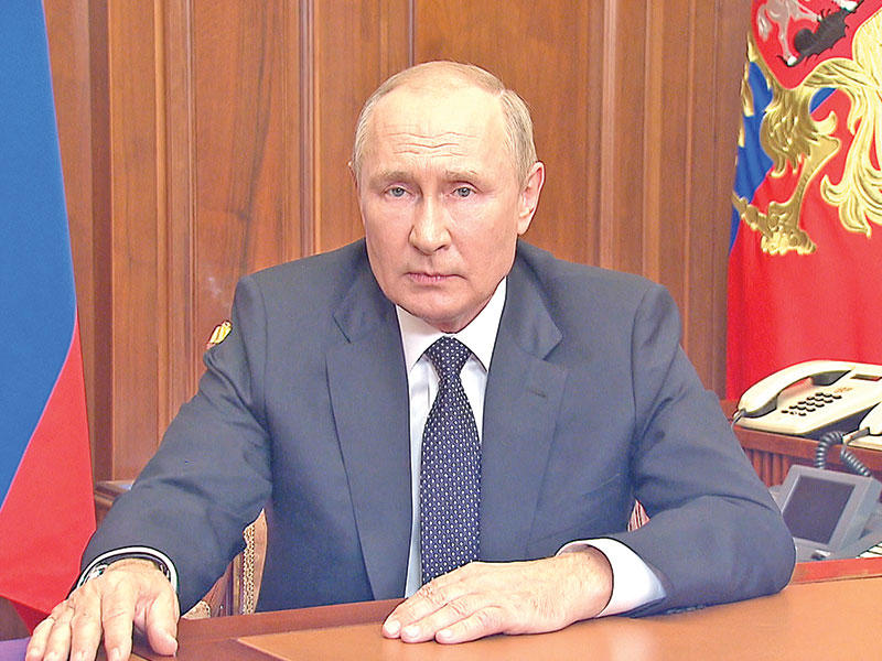 بعد الهزائم الأخيرة التي تكبدتها قواته في شرق أوكرانيا، خصوصاً في منطقة خاركيف «شمال شرق»، على يد الجيش الأوكراني المدعوم من الغرب، أمر الرئيس الروسي فلاديمير بوتين، أمس، بأول تعبئة للجيش منذ الحرب العالمية الثانية، وساند خطة قد تفضي لضم مساحات شاسعة من أوكرانيا، وأنذر الغرب بأنه لم يكن يخادع عندما قال إنه مستعد للجوء لأسلحة نووية للدفاع عن روسيا. وفي خطاب وجهه إلى الأمة، قال بوتين إنه وقع أمراً ببدء التعبئة، وان القوات المسلحة سوف تستدعي جنود الاحتياط فقط، وتزودهم بالتدريب الإضافي، إضافة إلى جميع المميزات التي يتمتع بها من يخدمون في الجيش، معتبراً أن كييف ابتعدت عن مباحثات السلام، وتتعامل وفقا لأوامر حلفائها، وبدلاً من التفاوض عززت جيشها بجنود قام حلف شمال الأطلسي (الناتو) بتدريبهم، والكثير منهم من النازيين الجدد المتطرفين.