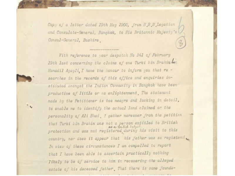 الرسالة التي أرسلها الوكيل السياسي البريطاني في الكويت عام 1905م شارحاً فيها شكوى تركي بن إبراهيم العقيلي، والتي تتلخص في وجود أملاك لوالده المتوفى في سيام (تايلند) مع شركاء ورغبته في أخذ إرثه منها، هذه الرسالة وصلت إلى القنصل العام البريطاني في بانكوك، والذي أخذ في التقصي والبحث عن حقيقة الأمر، لكنه بعد ثلاثة أشهر من التحقق لم يستطع الحصول على معلومات تؤكد ادعاءات تركي بن إبراهيم العقيلي. في بداية الرسالة الجوابية التي تم توجيهها إلى القنصل العام البريطاني في بوشهر، قال القنصل العام البريطاني في بانكوك إن البحث في السجلات الرسمية ومحاولات الحصول على معلومات من الجالية الهندية في بانكوك لم تنجح في الوصول إلى معلومات تؤكد الإفادة التي تقدَّم بها تركي بن إبراهيم العقيلي. وأضاف: «المعلومات التي قدَّمها الشاكي (تركي العقيلي) شحيحة، وتنقصها التفاصيل التي يمكنها أن تساعدني في معرفة موقع الأرض المقصودة وشخصية علي بهاي المشار إليها».