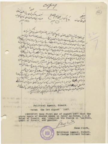 قبل حوالي ثلاث سنوات، نشرت في هذه الزاوية الأسبوعية وثيقة شرعية هي عبارة عن وكالة شرعية من سيدة كويتية اسمها حصة عبدالرزاق النصرالله إلى يوسف بن محمد المِنِيس ليقوم مقامها في متابعة أملاكها الموروثة لها من والدها في بوالخصيب وأم النعاج من مقاطعات البصرة. واليوم ننشر وثيقة أخرى لأسرة النصرالله ورد فيها اسم حصة النصرالله مرة أخرى، واسم سيدة كويتية أخرى، وأسماء رجال كويتيين. الوثيقة، في أساسها، عبارة عن وكالة رسمية شرعية عدسانية، لكنها نسخت بخط أحد موظفي الوكالة البريطانية السياسية في الكويت، وصادقت الوكالة على النسخة بغرض استخدامها في الدوائر العراقية. وباختصار، فقد تقدم شخصان هما يوسف بن محمد المِنِيس الدويري (الزوج الثاني لطيبة بنت أحمد النصرالله بعد وفاة زوجها الأول عبدالرزاق بن محمد النصرالله)، وحمد بن يوسف العدواني (صديق المنيس) إلى القاضي، وشهدا بأن طيبة النصرالله وابنتها (من زوجها المتوفى) حصة عبدالرزاق النصرالله، قد وكلتا محمد بن عبدالرزاق النصرالله (ابن طيبة واخو حصة) لمتابعة وضع أملاكهما في المقاطعات التابعة للبصرة. هذه الوكالة، كما يمكن أن نرى، هي أسبق من الوكالة الأخرى التي نشرنا نصها مسبقاً وتم فيها توكيل يوسف المنيس لمتابعة وضع الأملاك، والتأكد من تسوية الإرث الخاص بها. وإليكم نص وثيقة اليوم والتي ساعدني مشكوراً في قراءتها وتوضيح بعض معانيها ا. محمد نصرالله النصرالله: