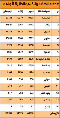وتضم الدائرة الأولى 13 منطقة هي: دسمان والشرق وبنيد القار والدسمة والدعية والشعب وحولي والسالمية والرميثية وسلوى وبيان ومشرف ومبارك العبدالله.وفي تفاصيل يوم الاقتراع، شهدت أغلب لجان الدائرة إقبالاً متزايداً منذ اللحظات الأولى لبدء عمليات الاقتراع، لاسيما في اللجنة الرئيسية بمدرسة عبدالله عبداللطيف العمر الابتدائية بنين بمنطقة مشرف، حيث توافد الناخبون على اللجان منذ الثامنة صباحا، كما شهدت لجنة مدرسة مشعان الخضير المشعان المتوسطة بنين حضورا متوسطا إلى جيد خلال الفترة الصباحية، بينما ازدادت وتيرة إقبال الناخبين على التصويت خلال الظهيرة والفترة المسائية، وكان لافتا أن أغلب الحضور من كبار السن في الفترة الصباحية.