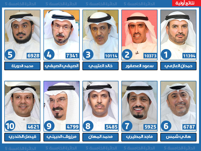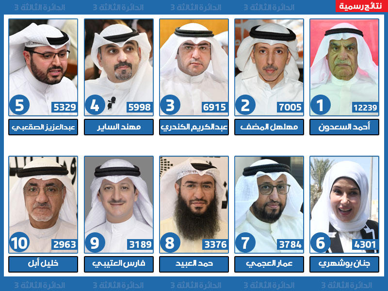 وفي الدائرة الثالثة، تغير نصف نوابها في المجلس السابق، في وقت كان لافتاً تصدر رئيس مجلس الأمة الأسبق أحمد السعدون للنواب العشرة الفائزين، برقم غير مسبوق في انتخابات الصوت الواحد منذ العمل به، بمجموع 12239 صوتاً، وفقاً للنتائج الأولية، وبفارق يتجاوز 5 آلاف صوت عن وصيفه مهلهل المضف، الذي جدد ناخبو الدائرة الثقة فيه مع كل من عبدالكريم الكندري، ومهند الساير، وعبدالعزيز الصقعبي، وفارس العتيبي، بينما جاءت الوزيرة السابقة جنان بوشهري في المركز السادس.وبنفس نسبة تغيير «الثالثة»، جددت جماهير الدائرة الرابعة الثقة بكل من شعيب المويزري، ومبارك الحجرف، وثامر السويط، وسعد الخنفور، وعبيد الوسمي، في حين رسخت نتائج «الخامسة» الثقة في النواب السابقين: حمدان العازمي، وخالد العتيبي، والصيفي الصيفي، ومحمد الحويلة.