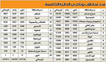 عاشت الدائرة الانتخابية الـ 5 أجواء مختلفة، إذ شهدت معظم مناطقها إقبالاً كثيفاً، منذ فتح صناديق الاقتراع عند الثامنة صباحاً أمس، وتوافدت المجاميع الانتخابية منذ ساعات الصباح الأولى عند لجان الاقتراع بمختلف المدارس، بعدد 34 مدرسة، تضم 118 لجنة للرجال، و121 للنساء، بين رئيسية وفرعية في مختلف مناطق الدائرة البالغ عدد ناخبيها وناخباتها 257913. ففي منطقة صباح السالم، جاء تسجيل الناخبين في مدرسة عبدالوهاب عبدالرحمن الفارس للذكور متواضعا حتى الحادية عشرة، لينشط بين الثالثة والرابعة عصراً ثم هدأ، وسجل الحضور ما يقارب 7800 من أصل 14157، في حين كان الحال أفضل في مدرسة نفيسة بنت الحسن للإناث، إذ زادت نسبة المشاركة بالتصويت إلى 61 في المئة بنحو 9200 من أصل 15986 ناخبة. وتسيّد الإقبال لدى كبار السن منذ الصباح الباكر، للمشاركة والإدلاء بالأصوات الانتخابية لدى مدرسة ابن زهر الأندلسي في منطقة العدان، والتي شاعت فيها مظاهر العرس الديموقراطي في 8 لجان، بنسبة الأصوات في اللجنة الرئيسية حتى الحادية عشرة 130 صوتا مقابل 1000 ناخب مقيد بها، أي بنسبة تجاوزت 10 في المئة من مجمل الأصوات.