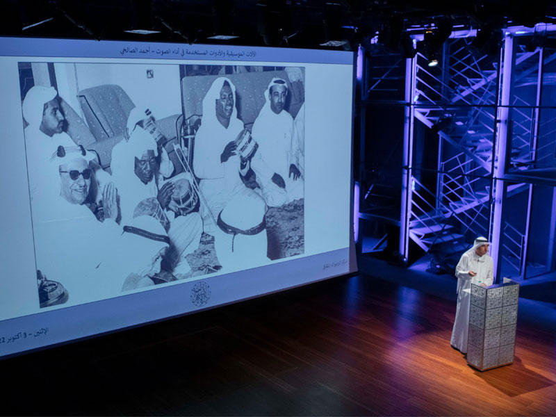 ضمن الموسم الثقافي الـ 27 لدار الآثار الإسلامية، أقيمت بمركز اليرموك الثقافي المحاضرة الأسبوعية بعنوان «الآلات الموسيقية والأدوات المستخدمة في أداء الصوت»، حاضر فيها د. أحمد الصالحي، وقدَّم المحاضِر وأدار حوله النقاش رئيس ديوانية الموسيقى بدار الآثار م. صباح الريس. وفي تقديمه، ذكر الريس أن د. الصالحي حاصل على شهادة الدكتوراه من رويال هولواي- جامعة لندن، في المملكة المتحدة، تخصص علم موسيقى الشعوب (Ethnomusicology)، ويعمل كمحاضر في المعهد العالي للفنون الموسيقية.بعدها استهل د. الصالحي المحاضرة، حيث قال: «غناء الصوت في الكويت والبحرين وبقية المناطق له خصوصية كبيرة، بسبب تميز هذا الفن بألحانه وآلاته وإيقاعاته، وغير ذلك من الجوانب الموسيقية، ولارتباطه بجميع شرائح المجتمع القديم في المنطقة، سواء مجتمع البحارة، أو مجتمع العمال، أو مجتمع المدينة. وتحوَّل الصوت مع ظهور الدولة الحديثة، من بداية الستينيات، إلى فن يمثل هوية شعوب المنطقة الثقافية، لقيمته أدبياً وموسيقياً، ولتداخله مع جميع أطياف المجتمع المحلي».