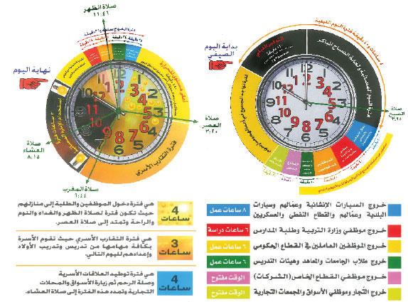 من جانبه، قال رئيس قسم الترشيد في قطاع وكيل الوزارة لوزارة الكهرباء والماء ناصر البلوشي: «كانت لدينا لجنة عليا للترشيد، تشمل وزارات الدولة والمؤسسات، وكان يرأسها المهندس خالد الجسار، وكان هناك مقترح عن تغيير الساعة اليومية، وهي فكرة موجودة في الكثير من الدول، أن يقدموا الساعة في الصيف ويتم تأخيرها في الشتاء». وتابع البلوشي: «الذي سيتغير في الصيف هو بدلا من النهوض من النوم الساعة 6 ينهضون الساعة 4 ، الإضاءة مازالت موجودة ولكن الهواء منعش في هذا الوقت، بحيث لا نحتاج إلى تشغيل التكييف، الجو العام سيكون منعشا، وهنا سنغير السلوك العام للحياة اليومية، إضافة إلى التوفير في الكهرباء عن طريق توفير استهلاك التكييف والاضاءات والسخانات ساعتين».ولفت الى انه «بتطبيق هذا الأمر يصل الموظفون للمنزل الساعة 12 ظهرا بدلا من الساعة الثانية، التي هي بداية ارتفاع درجات الحرارة وارتفاع الأحمال، وتقوم جهة العمل برفع درجة حرارة التكييف إلى درجات عليا والبعض يغلق التكييف، في هذه الحالة استغنينا عن الأحمال العالية».التكلفة