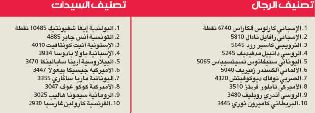 لدى السيدات، لم تشهد المراكز الـ13 الأولى أي تغيير، إذ ما زالت شفيونتيك تحلق بعيدة في الصدارة أمام التونسية أنس جابر، رغم خسارتها نهائي دورة أوسترافا التشيكية أمام صاحبة الأرض باربورا كرايتشيكوفا في مباراة ماراثونية استغرقت ثلاث ساعات و16 دقيقة، في إحدى أجمل مباريات السيدات هذا العام.بهذا الفوز، قفزت كرايتشيكوفا، بطلة «رولان غاروس» 2021، تسعة مراكز الى المرتبة 14.