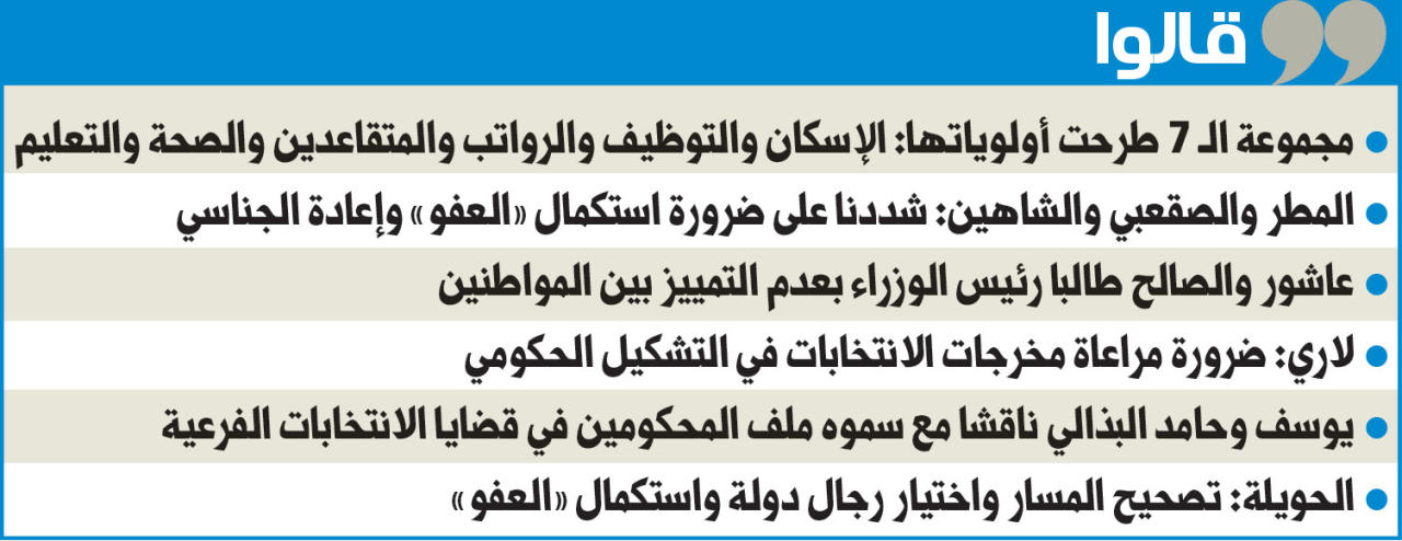 وقال لاري في تصريح له «التقى نواب التآلف الإسلامي صباح أمس رئيس الوزراء، ودار الحديث حول أهم المستجدات على الساحة المحلية، وتمت مناقشة أهمية تقديم الحكومة برنامج عملها فور تشكيلها، عملا بنص الدستور»، موضحا أن الاجتماع ساده جو من الاهتمام في دفع الأمور نحو الاستقرار، والعمل على تحقيق تطلعات المواطنين.كما التقى سموه النائبين يوسف البذالي وحامد البذالي، وفق ما أعلن النائبان، مشيرين إلى أن اللقاء تطرّق لموضوع المستوى المعيشي للمواطنين وأهمية التمسك بالدستور والقانون، وبرنامج حكومة يحقق تطلعات المواطنين، وناقشا مع سموه ملف المحكومين في قضايا الانتخابات الفرعية والعفو عن المهجّرين والمحكومين في قضايا الرأي.بدوره، قال النائب حامد البذالي: التقيت أمس سمو رئيس الوزراء، وكانت لسموه مبادرات ايجابية في الاستجابة للمجلس لتغيير التشكيل الحكومي، والتشاور مع النواب لاختيار الحكومة الجديدة، وكذلك تحديد معايير لاختيار القياديين ذوي الخبرة لشغل المناصب الشاغرة، وأكدت استكمال العفو عن المهجّرين والعفو عن المسجونين في قضية شمر.والتقى سموه النائب محمد الحويلة، الذي قال في تصريح مساء أمس: التقيت قبل قليل سمو رئيس مجلس الوزراء، وكان لقاءا مثمراً وإيجابيا ناقشنا فيه ضرورة أخذ مبدأ تصحيح المسار محل تنفيذ، وذلك باختيار رجال دولة أكفاء من المشهود لهم بالوطنية والنزاهة ممن يعين سموه على حمل أمانة التكليف، وأخذ الكويت إلى حيث يجب أن تكون في مصاف الدول المتقدمة، وقد ناقشنا مع سموه ضرورة الابتعاد عن كل الإجراءات التي قد تكون محل شبهة دستورية أو اعتراض شعبي، حتى يكون طريق العمل ممهدا وسالكا، وبحثنا العديد من القضايا والقوانين ذات الأولوية، ومنها استكمال ملف العفو الكريم، وتضمین إخواننا الأعزاء من قبيلة شمر الذين صدر بحقهم حكم مفاجئ، وكذلك إخواننا الشيوخ الأفاضل د. شافي العجمي ومحمد العجمي ومسعود الهاجري، وإعطاء التوجيهات اللازمة لكل الجهات، وعلى رأسها وزارة الخارجية، باستعجال إغلاق ملف أخينا الشيخ حجاج العجمي.