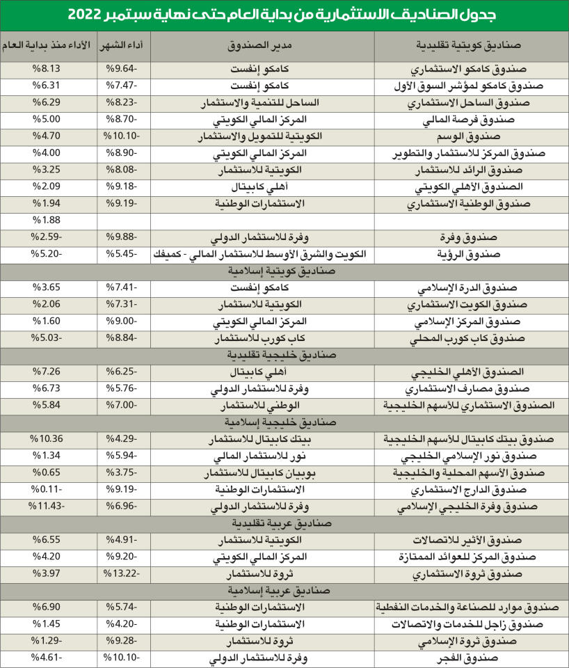 بالرغم من الاضطرابات التي خيمت على الأسواق العالمية، وانعكست بشكل حاد على بورصة الكويت، فقد حافظت الصناديق المحلية على أداء إيجابي لمجمل الأشهر التسعة الأولى من 2022، وجاء صندوق كامكو الاستثماري الأعلى أداء على مستوى الصناديق المحلية بعائد من بداية العام بلغ 8.13 في المئة. وتراوح الأداء على مستوى الصناديق التقليدية والإسلامية بين 1.60 في المئة لصندوق المركز الإسلامي، و8.13 في المئة لصندوق كامكو الاستثماري الأعلى أداء على كل الصناديق التقليدية والإسلامية والخليجية والعربية بشقيها.وعلى صعيد أداء سبتمبر كان سلبيا على كل الأسواق، حيث لم تتمكن من مقاومة العواصف الآتية من الأسواق العالمية المدعومة سلبيا من تطورات الأحداث الجيوسياسية، خصوصا تسارع وتيرة الحرب الروسية- الأوكرانية.