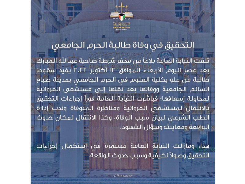 انتقد عدد من أعضاء مجلس الأمة البيان الرسمي الذي أصدرته جامعة الكويت بشأن حادثة سقوط طالبة في كلية العلوم من الدور الثاني داخل الحرم الجامعي، ووفاتها بأحد مستشتفيات وزارة الصحة متأثرة بإصابتها، حيث كشف بيان الجامعة أن تحريات المباحث الأولية دلّت على شبهة انتحار، وهذا ما رفضه نواب المجلس جملة وتفصيلا، مؤكدين أن البيان لم يحترم جهات التحقيق ولم يقدّر خصوصية أسرة الطالبة، داعين في الوقت نفسه إلى سحبه فورا.ورفض النائب أسامة الشاهين بيان الجامعة بشأن وفاة الطالبة، قائلا: أعزي ذوي الفقيدة الفاضلة وكل منتسبي ومنتسبات جامعة الكويت، فالمصاب جلل والتعزية واجبة، مؤكدا أن بيان الإدارة الجامعية مرفوض وغير لائق، وسحبه واستدراكه واجب.فيما قال النائب محمد الحويلة: نعزي أنفسنا وذوي الفقيدة طالبة كلية العلوم، ونسأل الله لها الرحمة والمغفرة ولذويها الصبر والسلوان، مبينا أن هذه الحادثة كشفت عن نقص وحاجة ماسة لوجود مستشفى ميداني مصغّر ومجهز، ووحدة للإسعاف، داخل حرم الجامعة لعلاج وإسعاف أي حادث فور وقوعه لا قدّر الله، وهو ما يجب على الحكومة استدراكه فورا.