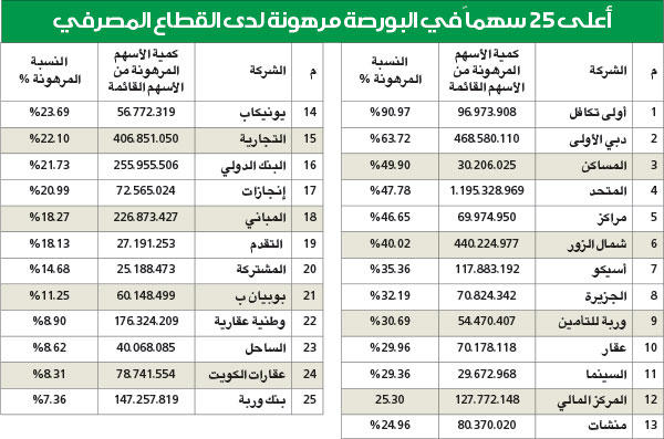 الجريدة. تنشر أعلى 25 سهماً لشركات مدرجة مرهونة