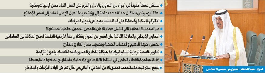 وشدد سموه على أن الالتزام بمبدأ التعاون لا يجرد أي سلطة من اختصاصاتها أو مصادرة حقوق أعضائها، بل هي دعامة دستورية لتعزيز العمل المشترك وإقامة حوار ديموقراطي ونقد بناء، مضيفا: «تتطلع الحكومة إلى علاقة مثمرة مع مجلسكم الموقر، وستقدم برنامج عملها تطبيقا لأحكام المادة 98 من الدستور، مستوعبة مجمل أولويات المرحلة المقبلة، المتسمة بالواقعية وقابلية التنفيذ وفق برنامج زمني محدد. وكان لافتاً ما قاله سموه»، فقد صدر التوجيه السامي للوزراء بوضع آلية لاستقبال المواطنين وتذليل المعوقات كافة التي تواجه معاملاتهم وإيجاد الحلول لها، وإنهاء الملفات العالقة، وغلق أبواب الواسطة والمحسوبية، وإدراج خدمة المواطن عبر التطبيق الحكومي الموحد للخدمات الإلكترونية (تطبيق سهل)، للتواصل مع الوزراء مباشرة لتقديم المقترحات والشكاوى والملاحظات، كما تم توجيه الوزراء بالعمل على إعادة تقييم أداء القياديين وأسس اختيارهم وتجديدهم».جاء ذلك في الخطاب الأميري الذي ألقاه سمو رئيس مجلس الوزراء أمس في جلسة افتتاح دور الانعقاد العادي الأول للفصل التشريعي السابع عشر لمجلس الأمة، الذي افتتحه سمو نائب الأمير ولي العهد الشيخ مشعل الأحمد، وفيما يلي نص الخطاب الأميري لسموه:«بسم الله الرحمن الرحيم{وأن ليس للإنسان إلا ما سعى وأن سعيه سوف يرى}.الحمد لله العزيز الحكيم الذي أفاض علينا من نعم لا تُحصى، وجعل لنا طريق الهداية ووفر لنا أسباب الخير والفلاح، والصلاة والسلام على نبينا محمد وعلى آله وصحبه وسلم.الأخ رئيس مجلس الأمة،،،الأخوات والإخوة الأعضاء المحترمين،،،السلام عليكم ورحمة الله وبركاته،،، أما بعد، وقد شرفني اليوم حضرة صاحب السمو أمير البلاد - حفظه الله ورعاه - بإلقاء الخطاب الأميري بمناسبة افتتاح دور الانعقاد العادي الأول للفصل التشريعي السابع عشر لمجلس الأمة الموقّر، فإنه يطيب لي أن أبارك لكم ثقة الشعب الكويتي وآمال أمامكم، متمنيا لكم باسمي واسم أخواتي وإخواني أعضاء الحكومة التوفيق والسداد في خدمة الوطن ورفعة شأنه.كما أتقدم بأصدق آيات التقدير والاعتزاز لشعبنا الكريم الذي استجاب لرسائل وتوجيهات كلمة حضرة صاحب السمو الأمير وولي عهده الأمين - حفظهم الله ورعاهم - في خطابهم الموجه إلى أبناء الوطن العزيز في الثاني والعشرين من يونيو الماضي، لإعادة تصحيح مسار المشهد السياسي واختيار من يمثله بإرادة حقيقية، ضمن أجواء تتسم بالتنافس الشريف والاختيار الحر، لذا جاء المرسومان بقانون على وجه الاستعجال، إعمالا لحكم المادة (71) من الدستور بتعديل وإضافة عدد من المواد في شأن انتخابات أعضاء مجلس الأمة، ليكون موطن الانتخاب معبرا عن المكان الذي يقيم به المواطن بصفة دائمة وفعلية والثابت ببطاقته المدنية. الأخ رئيس مجلس الأمة،،،الأخوات والإخوة الأعضاء المحترمين،،،نلتقي اليوم لافتتاح دور الانعقاد الأول لمجلسكم الموقر، نستقبل عهدا جديدا بأجواء من التفاؤل والأمل والعزم على العمل الجاد ضمن أولويات وطنية، والأداء المسؤول والمضي نحو مرحلة جديدة من التعاون المنشود.ولعلنا اليوم ونحن نستقبل عهدا جديدا بحاجة إلى رؤية جديدة للعمل الوطني، تستند إلى أسس الإصلاح، والالتزام بالحكمة والحفاظ على المكتسبات، والمشاركة الفعالة لتحقيق الطموح والآمال الشعبية، بعيدا عن أجواء الصراعات وتغليب المصالح الشخصية على حساب استقرار الوطن وتقدمه وازدهاره، وصيانة وحدتنا الوطنية التي تشكل صمام الأمان لروح المواطنة ووحدة الصف والكلمة، والحصن الحصين لحاضرنا ومستقبلنا كي نحمي بلادنا من الفتن والتفكك، ما يجعل من أمن البلاد واستقرار وحدتها وهيبة مؤسساتها همنا الأكبر مجلسا وحكومة. الأخ رئيس مجلس الأمة،،،الأخوات والإخوة الأعضاء المحترمين،،،إننا أمام مسؤولية وأمانة وطن ومستقبل شعب كريم، وهي أمانة تكليف لا تشريف، نحن جميعا شركاء في حملها وصيانتها، توجب الحكمة واليقظة واتخاذ التدابير كافة التي رسمها الدستور، وأقرتها القوانين و
